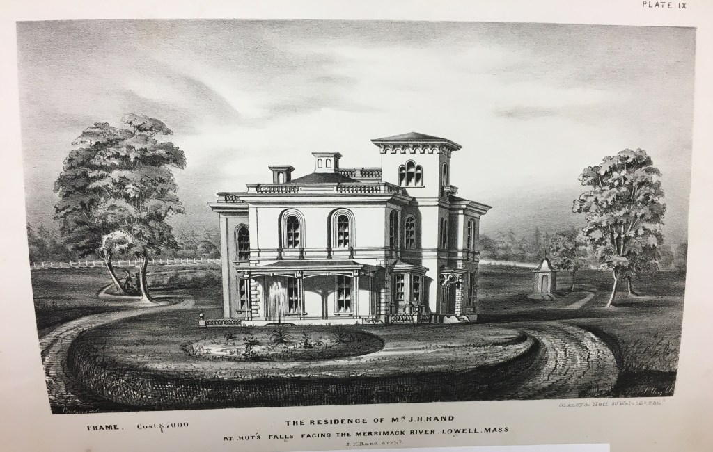 1850 was also the year that James C. Sidney, the noted Philadelphia cartographer, civil engineer and architect, along with partner James Neff, published their exceptional, illustrated map of Lowell. Sidney and Neff made a number of city maps but the Lowell example is the most distinctive. Sidney was the original designer of Philadelphia’s celebrated Fairmount Park. Rand’s house was one of the principal buildings that illuminated the map’s margins. Sidney must have been significantly impressed because he not only included it on the map but also as an example in his, American Cottage & Villa Architecture, A series of Plans and Views of RESIDENCES ACTUALLY BUILT. Intended as models for those about to build, as well as Architects, Builders, etc. It was published that same year as a subscription series. Unfortunately, there is no existing floor plan but the perspective view better demonstrates the architectural finesse that Coolidge admired and showcased Rand’s talent to a wider audience beyond Lowell. Coincidentally, the only other Boston area work illustrated was the Abbott Lawrence House in Brookline designed by Richard Bond of Roxbury.