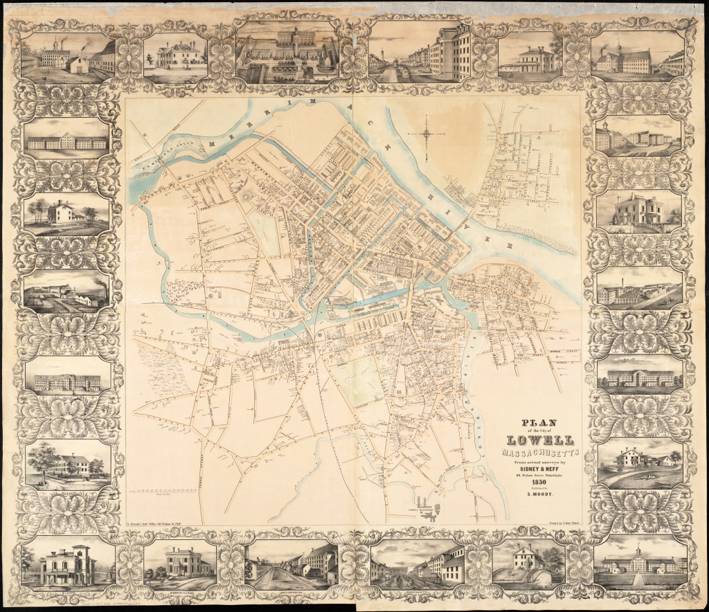 Rand must also have had a large hand in the Sidney & Neff map and may have selected and produced the marginal illustrations. The handsome map is peculiar because while it illustrates the major corporations, absent are typical local landmarks, such as churches, schools and commercial blocks found on the other Sydney and Neff works. In truth, there were few landmarks beyond the millyards to showcase. Among the substantial mansion houses, are three coincidentally designed by Rand. It’s quite possible that Rand designed more if not all of the houses illustrated such as the Fletcher House and Moody House which share stylistic elements of his known works.